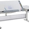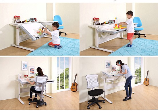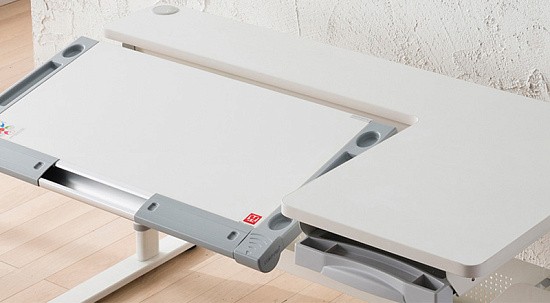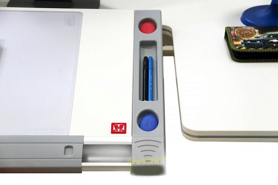 Компактный ящик с органайзером, который расположен под фиксированной частью столешницы, дает возможность хранить школьные предметы и мелкие канцтовары.