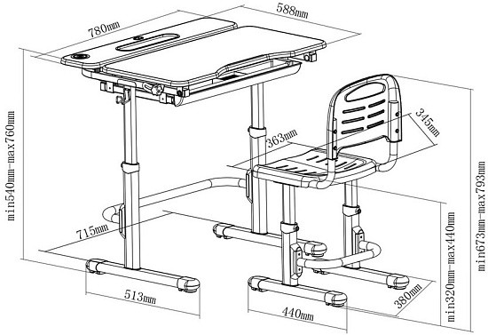 Стол и стул могут быть легко отрегулированы по высоте, что позволяет оптимально адаптировать его под соответствующий рост ребенка.
