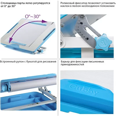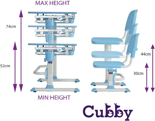 Cubby Karo - новая растущая детская парта со стульчиком. Очень важно, чтобы ребенок правильно сидел за столом при выполнении домашнего задания. Детская парта Karo предназначена для обеспечения более комфортной среды обучения. Стол и стул могут быть легко отрегулированы по высоте, что позволяет оптимально адаптировать его под соответствующий рост ребенка. Поверхность учебного стола можно наклонять до 35 градусов для удобного письма, чтения и рисования. Отсеки ящика в нижней части стола предоставляют достаточное количество пространства для книг и канцелярских принадлежностей.