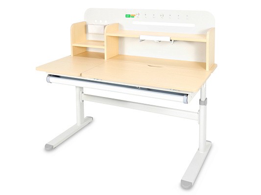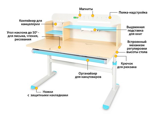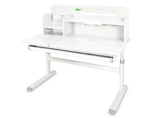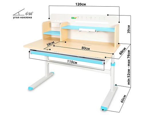 Регулировка высоты столешницы 52-76 см. Высота стола регулируется с помощью механической ручки, что дает возможность легко настроить парту под рост ребенка. Стол с трансформирующейся столешницей, которая изменяет угол наклона до 50 градусов с помощью механизма газлифт. Вы можете установить оптимальный угол наклона столешницы для чтения, письма или рисования.