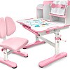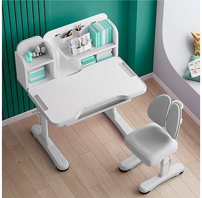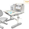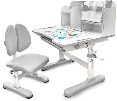 Главной особенностью комплекта является растущее кресло с двойной ортопедической спинкой и мягким съемным сиденьем, обтянутым мебельной дышащей тканью. Кресло регулируется по высоте и глубине специальными винтами. Максимальная нагрузка - 60 кг. На каркасе крепится ручка для удобного перемещения кресла по комнате.