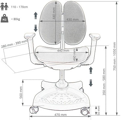 FunDesk Vetro для детей от 3 лет и до подросткового возраста. Подходит для роста от 110 до 170 см. Можно использовать как с растущей партой, так и с обычной. Изменяя глубину спинки и высоту сидения, Вы подберете наиболее комфортное положение для ребенка. Колеса имеют функцию стоп-вращения при посадке в кресло ребенка свыше 25 кг. В кресле FunDesk Vetro блокировка происходит благодаря кнопке, которая при включении (функция ON) блокирует колеса и прекращает движение на любой поверхности под давлением 20 кг. При выключении кнопки (функция OFF) на колесиках кресла, его свободно можно передвигать по комнате. Малыш не будет отвлекаться от уроков, катаясь на кресле. Кресло имеет подставку для ног.
