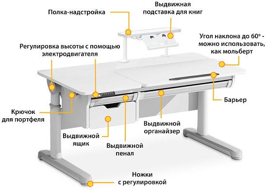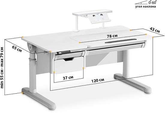 Для формирования хорошего почерка необходим наклон столешницы около 10 градусов. Для рисования красками столешница должна быть горзонтальной, а для рисования карандашом удобен наклон столешницы 45 градусов. Ребенок без труда сможет установить нужный наклон столешницы благодаря удобному и надежному газ. лифту.