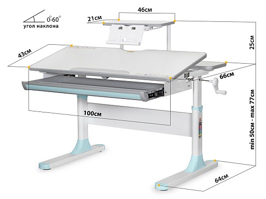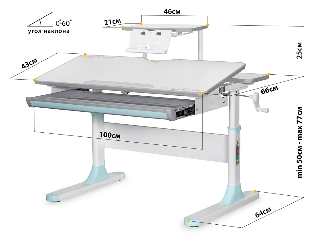 С помощью газлифта столешница меняет угол наклона до 60 градусов, что помогает сохранить правильную осанку при работе за столом.