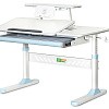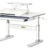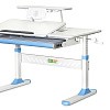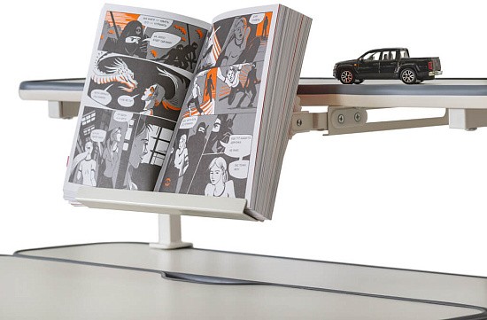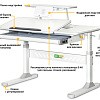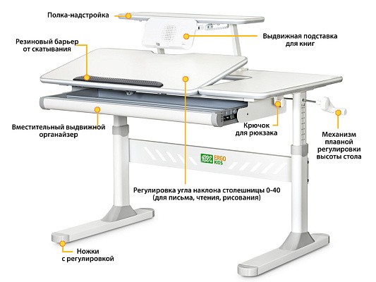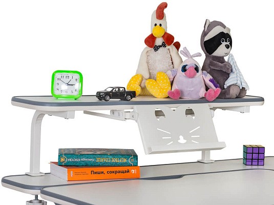 Стол дополнен съемной полкой, на которой можно размещать учебники. Полка имеет регулируемую металлическую подставку для книги. Подставка для книг находится на безопасном расстоянии от глаз ребенка, таким образом сохранится зрение. По окончанию работы, подставку можно задвинуть.