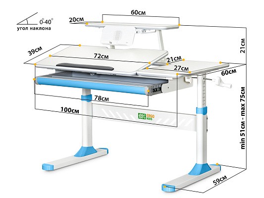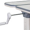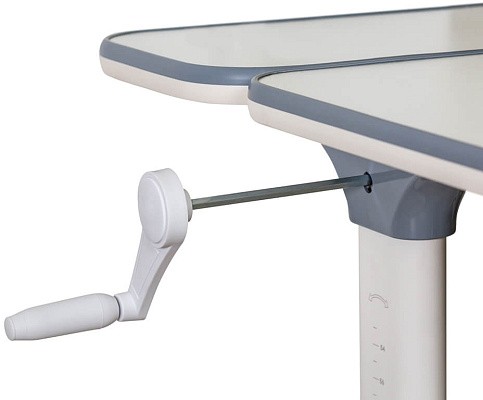 Столешница разделена на подвижную и не подвижную части. Подвижная часть столешницы меняет угол наклона до 60 градусов. Плавность регулировки обеспечивает газлифт. Для изменения положения столешницы достаточно мягко нажать на рычажок и потянуть на себя. Для безопасности регулировки детьми на столешнице предусмотрен зазор, чтобы не прищемить пальцы. Благодаря большому диапазону угла наклона столешницу можно использовать, как мольберт.