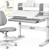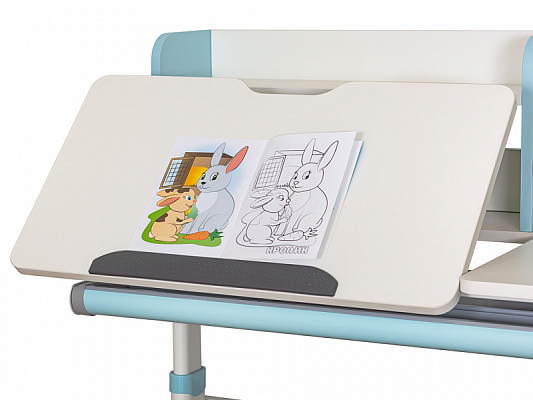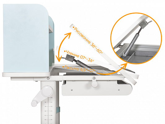 Столешница разделена на две части. Подвижная часть изменяет угол наклона до 60 градусов с помощью газлифта, что позволяет подобрать положенияе для чтения, письма, рисования. Для безопасности регулировки детьми на краю столешницы предусмотрен специальный зазор.
