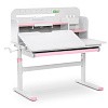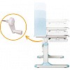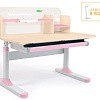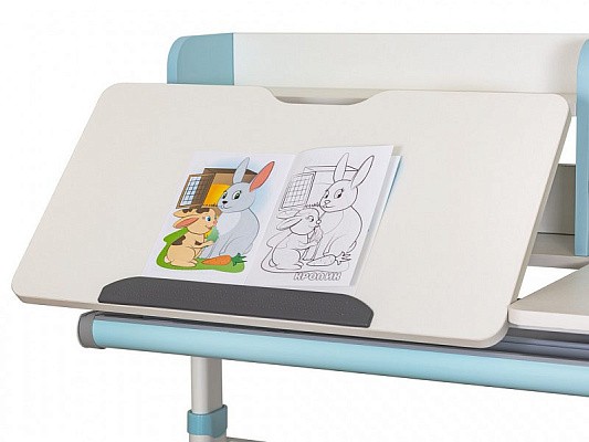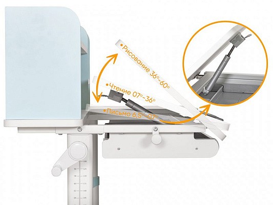 Столешница разделена на две части. Подвижная часть изменяет угол наклона до 60 градусов с помощью газлифта, что позволяет подобрать положенияе для чтения, письма, рисования. Для безопасности регулировки детьми на краю столешницы предусмотрен специальный зазор.