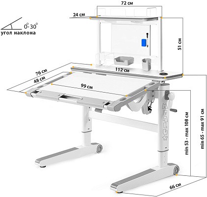 Рабочая поверхность стола с регулируемым углом наклона до 30 градусов. Поэтому, можно установить оптимальный угол наклона для занятий (чтение, письмо, рисование). в результате, будет поддерживаться правильная осанка, а также глаза ребенка будут на безопасном расстоянии от учебника / тетради.