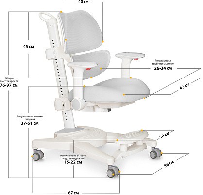 У кресла раздельная регулировка высоты спинки и сиденья. Это поможет наиболее точно настроить кресло под рост ребенка.