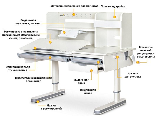 Рабочая часть столешницы меняет угол наклона до 60 градусов с помощью специального газлифта.. На столешнице есть зазор для безопасного процесса регулировки, с которым справится даже ребенок. Угол наклона меняется ступенчато и можно очень просто подобрать положение для чтения, письма, рисования.