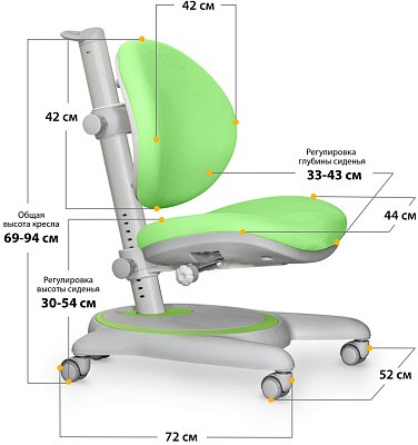 У кресла независимая регулировка высоты спинки и сиденья. Регулировка осуществяется с помощью специальных винтов на металлической несущей трубе Глубина сиденья регулируется ручкой -фиксатором. Кресло подойдет для детей от 3х лет до взрослого возраста.