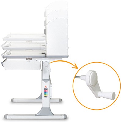 Высота всего стола плавно регулируется с помощью специальной механической ручки, которая расположена сбоку. Шкала соотношения роста ребенка, что изображена на ножках, поможет самостоятельно подобрать оптимальную высоту.