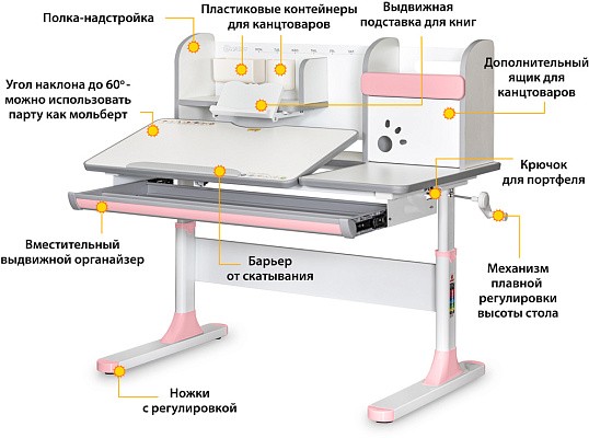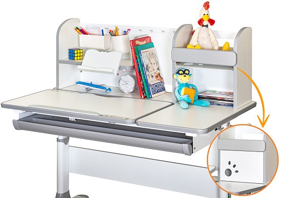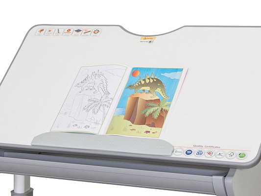 Подвижная часть столешницы меняет свой угол наклона с помощью специального газлифта. Одно плавное нажатие и вы трансформируете рабочую зону для письма и чтения, а благодаря большому углу наклона (до 60 градусов) столешницу можно использовать для рисования, как мольберт. Чтобы ребенок не травмировался, когда самостоятельно будет менять угол наклона, на столешнице есть безопасный зазор.