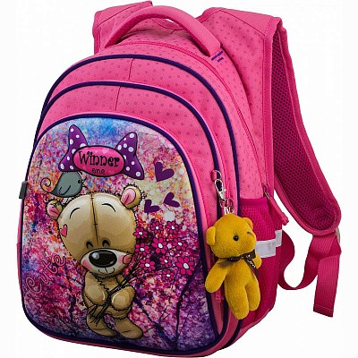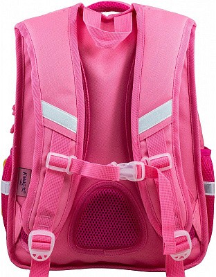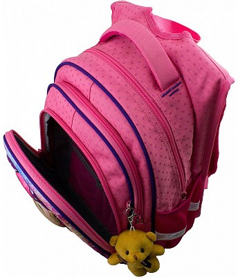В рюкзаке три отделения. Первое основное и второе отделения без наполнения. Третье отделение с органайзером для письменных принадлежностей. По бокам два кармана-сеточки на резинке.
